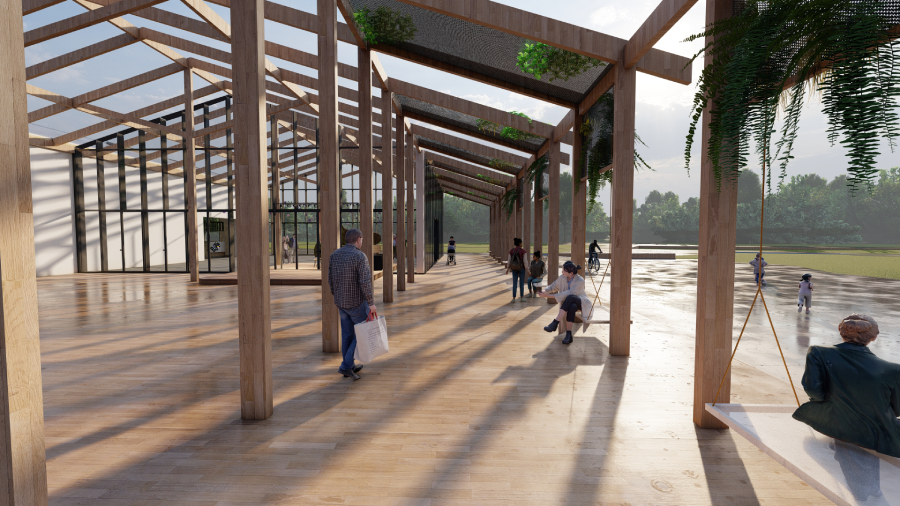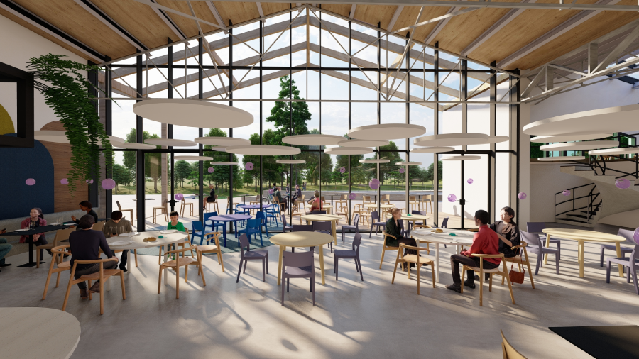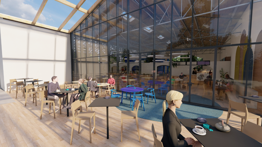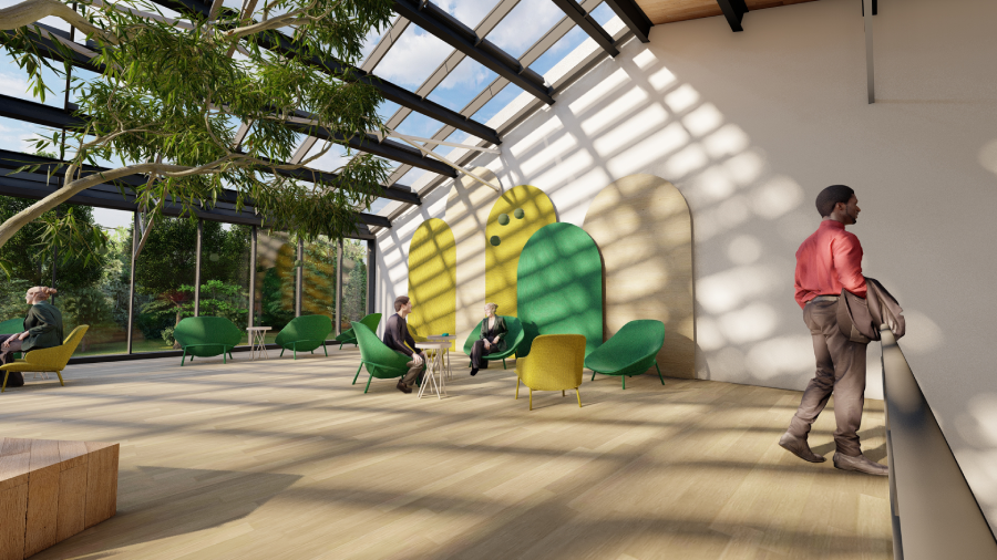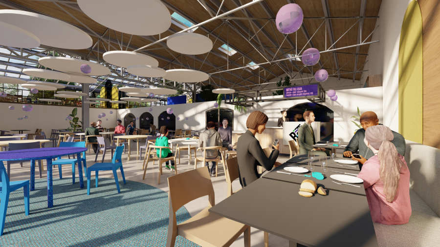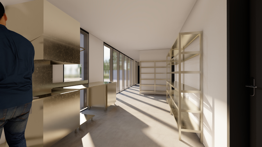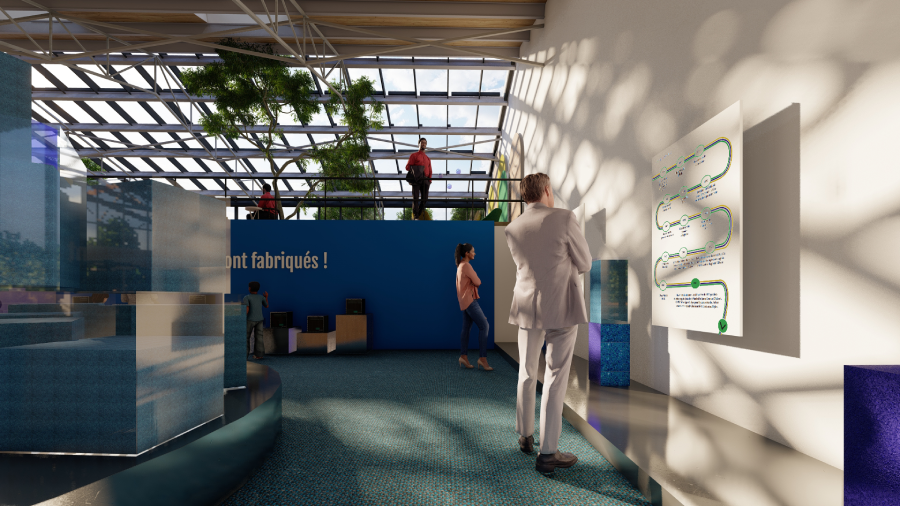 Le plastique recyclé est mis en avant de manière métaphorique à travers des espaces phares dans le lieu. Ils apparaissent comme des points bleus synthétiques dans une atmosphère chaleureuse aux matériaux bruts et naturels, comme une bouteille perdue dans la nature. Le premier espace phare est un espace immersif et instructif qui guide le visiteur de la bouteille vide à la transformation de cette matière. Le deuxième espace est un espace témoin explicatif sur l’utilisation de matériaux recyclés dans l’ensemble du lieu que l’on retrouve sous formes de textiles, terazzo, carrelages, panneaux acoustiques, revêtement mural et revêtement de sol, etc.